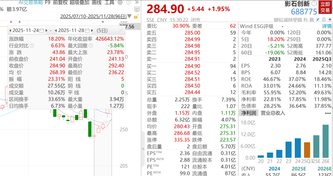 受高空发布会及探月项目消息影响,二级市场反应强烈。11月27日,影石创新股价以5.23%的涨幅开盘,最终收涨8.94%,全日成交3.94万手,成交额达11.1亿元,主力资金净流入1.72亿元。截至当日收盘,影石创新报279.46元/股,总市值约为1121亿元。