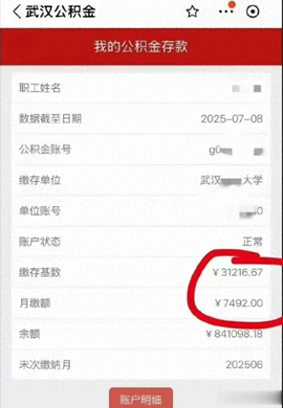 近日,有网友分享了武汉某211大学教授的公积金缴纳明细——每月7492元的缴纳额令不少网友直呼“羡慕”。
